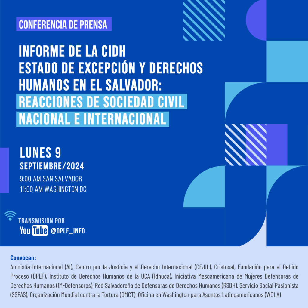Organizaciones nacionales e internacionales de derechos humanos convocamos a una conferencia de prensa para abordar el reciente informe de la Comisión Interamericana de Derechos Humanos (CIDH) titulado “Estado de excepción y derechos humanos en El Salvador”. Ver grabación de la conferencia aquí. Este encuentro se realizó el lunes 9 de septiembre de 2024, a las 9:00 […]