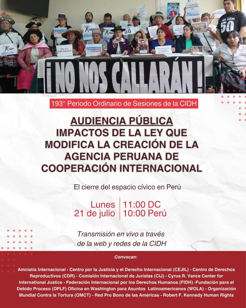 En el marco del 193 Período de Sesiones de la CIDH, organizaciones internacionales de derechos humanos presentaremos información sobre los impactos de la Ley APCI, la cual impone controles desproporcionados a oenegés, criminaliza la defensa legal de víctimas y debilita el Estado de Derecho en el Perú.