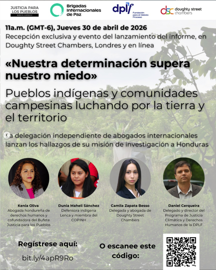 DPLF, junto con Peace Brigades International UK, Bufete Jurídico Justicia para los Pueblos y Doughty Street Chambers, le invitamos a una recepción exclusiva y al lanzamiento de un importante nuevo informe elaborado por una Delegación Independiente de Abogados Internacionales, que expone graves violaciones contra pueblos indígenas y comunidades campesinas en Honduras.